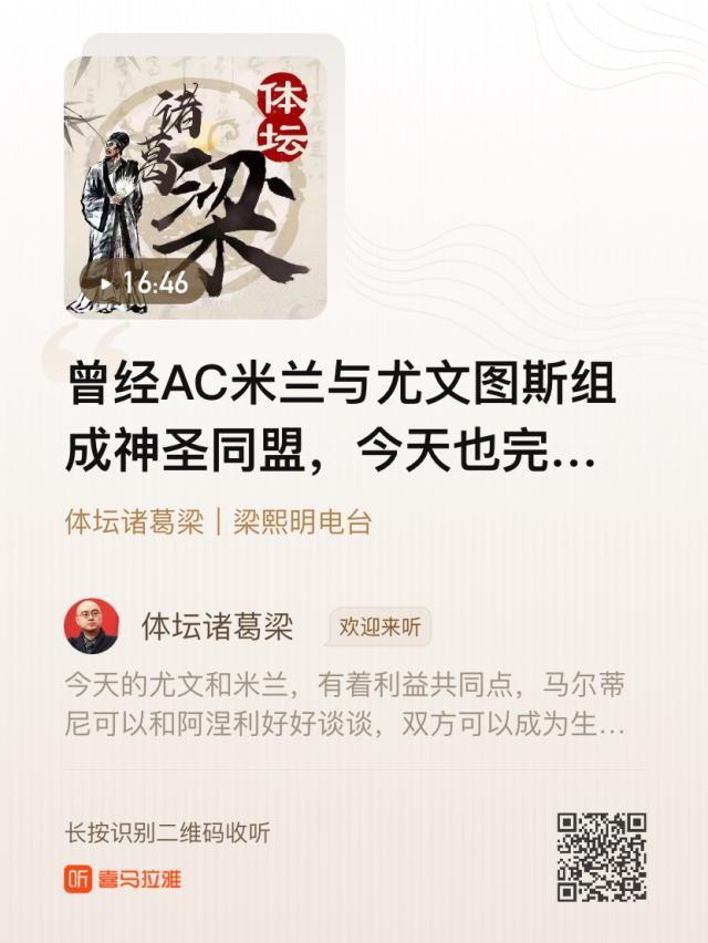 由《体坛周报》与喜马拉雅FM联合推出的播客节目——《体坛诸葛梁丨梁熙明电台》正式上线。 今天的尤文和米兰,有着利益共同点,马尔蒂尼可以和阿涅利好好谈谈,双方可以成为生意上的伙伴。 点击下方链接,或登录喜马拉雅搜索“体坛诸葛梁”,即可收听节目,与梁熙明就足坛热点展开交流。 曾经AC米兰与尤文图斯组成神圣同盟,今天也完全可以再成盟友...